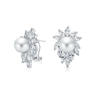 Bling Jewelry Classic Cocktail Party Halo Leaf CZ Marquise 10 MM White Simulated Pearl Stud Earrings Omega Back Rhodium Plated Brass