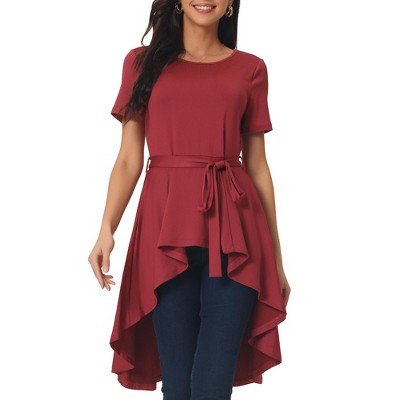 Seta T Women's Round Neck Tie Waist Asymmetrical Irregular Hem Short Sleeve Tops