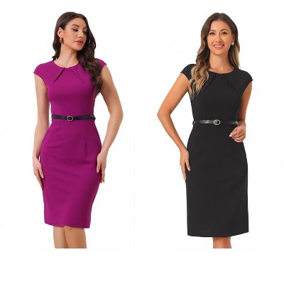 INSPIRE CHIC Women's Elegant Business Round Neck Belted Cap Sleeve Work Sheath Dresses 2 Packs
