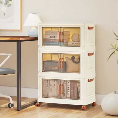VECELO 3/4/5 Tier Stackable Storage Bins with Lid, Folding Storage Cabinet with Double Door & Wheels, Milky White
