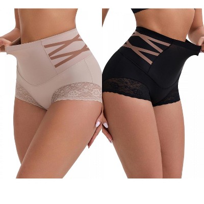 INSPIRE CHIC Women's Wide Lace Trim High-Waisted Tummy Control Butt-Lifting Breathable Shaping Panties 2 Packs