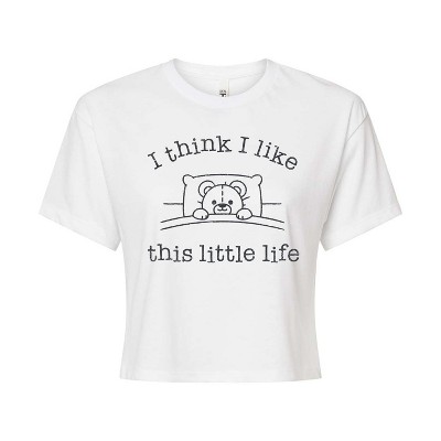 Women's - Instant Message - I Think I Like This Little Life Bear In Bed Cropped Graphic T-Shirt