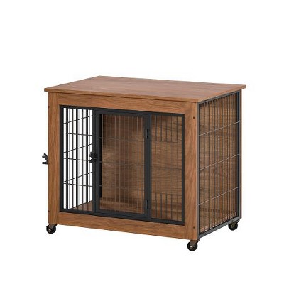 Akoasm 32.5 in. W Small Dog Wooden Double-Door Crate Furniture with Wheels for Anxious Dogs-Brown