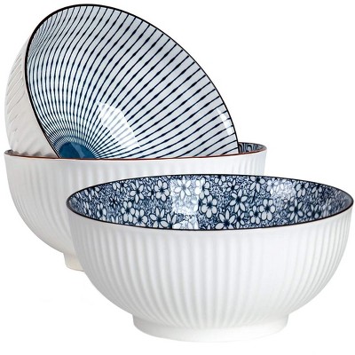 Aoibox 60 oz Large Soup Bowls Set of 3 Blue and White Porcelain 8 in Diameter Japanese Ramen Pho Bowls Microwave Dishwasher Safe