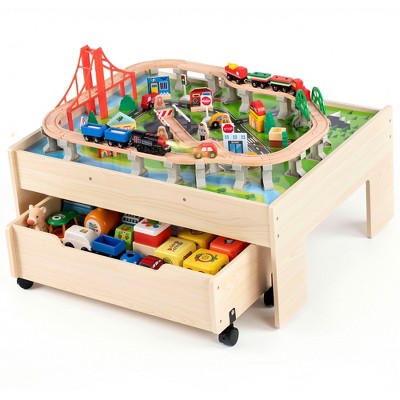 100-Piece Wooden Train Table Set with Reversible Top, Rolling Storage Drawer, Electric Engine, Ages 3+