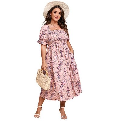 Coolmee Women's Plus Size Floral Summer Dress Puff Sleeve Smocked Ruffle Square Neck Casual Dress Cute Midi Dress