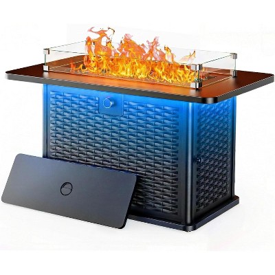 Okak Propane Fire Pit with Windproof Lid, Outdoor Fireplace with Slat Tabletop, Fire Pit Table for Backyard, Garden, Patio, Black