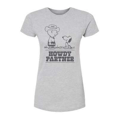 Women's - Peanuts - Charlie Snoopy Howdy Partner -Juniors Fitted Short Sleeve Graohic T-Shirt Fitted Graphic T-Shirt