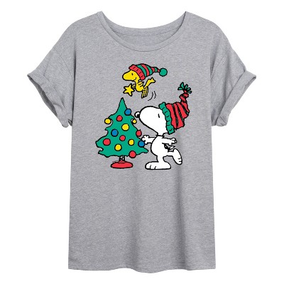 Women's - Peanuts - Snoopy Woodstock Christmas Tree Oversized Graphic T-Shirt