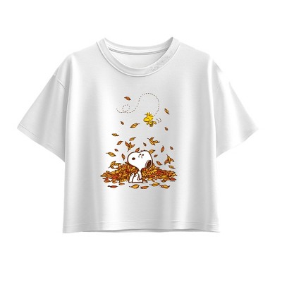 Girls' Peanuts Snoopy & Woodstock Leaves Short Sleeve Boxy Graphic T-Shirt - White - X-Large