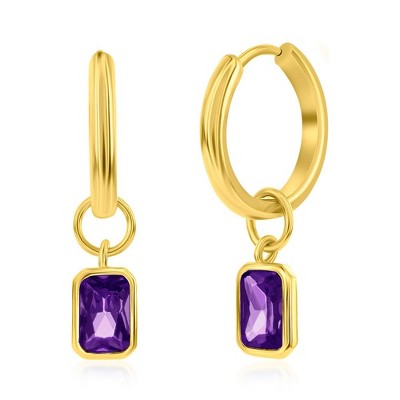 Bella Silver Sterling Silver, 'February' Rectangle CZ Charm Hoop, Gold Plated Earrings - Amethyst - Purple