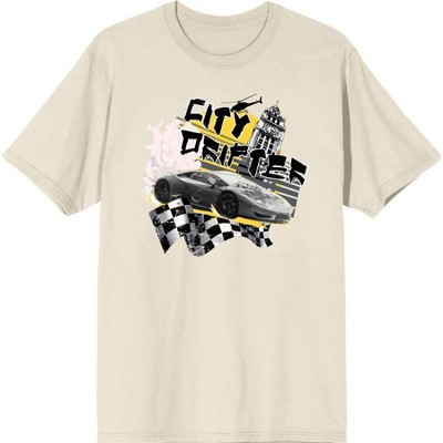 City Drifter Race Car With Flag And Clock Tower Adult Crew Neck Short Sleeve Tee