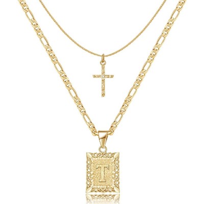 Women's 14K Gold Plated Initial Necklace with Round Letter Pendant from A-Z on Figaro Chain