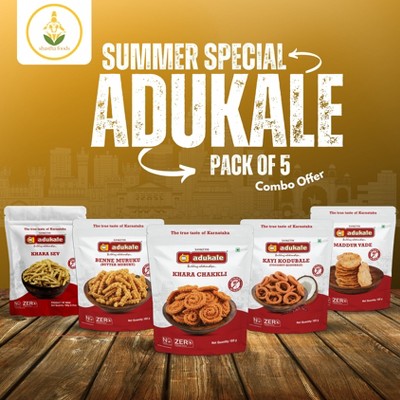 Adukale Summer Special Traditional Spicy Combo - Khara Sev, Benne Murukku, Khara Chakli, Kayi Kodubale & Maddur Vade - Pack of 5