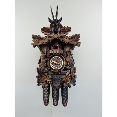 One Day Cuckoo Clock Chalet 14.5" – Lady Rings Bell, Hand-Carved Trees, Dog & Bunny By River City Clocks