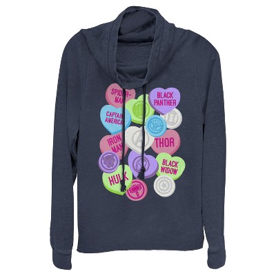 Juniors Womens Marvel Valentine's Day Candy Heart Heroes Cowl Neck Sweatshirt