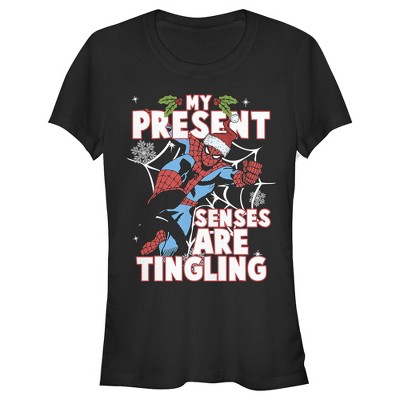 Juniors Womens Marvel Spider-Man Present Senses Tingling Holiday T-Shirt