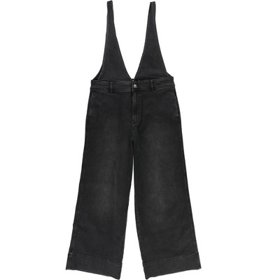Womens Denim Overall Relaxed Fit Button Front Distressed Wide Leg Overalls with Pockets Dark Blue L