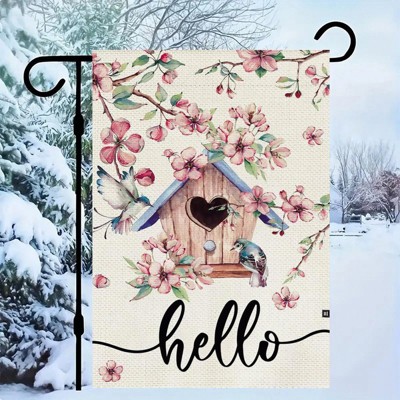 Spring Single-Sided Burlap Garden Flag | Pink Floral Bird House & Cherry Blossoms Outdoor Yard Welcome Decor 12x18in
