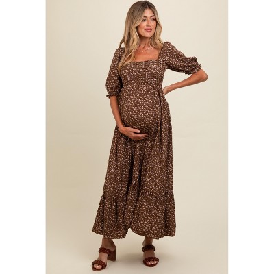 Pinkblush Brown Floral Smocked Puff Sleeve Maternity Maxi Dress