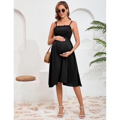 Maternity Summer Dress Sleeveless Smocked Square Neck Adjustable Spaghetti Strap Midi Dress Photoshoot