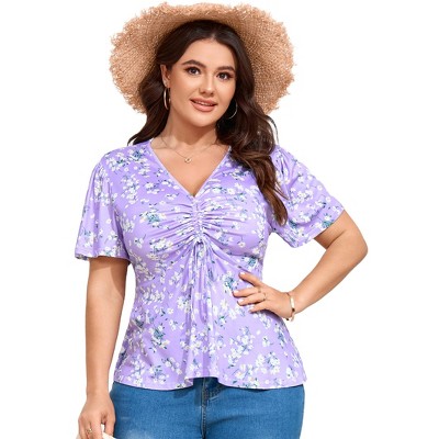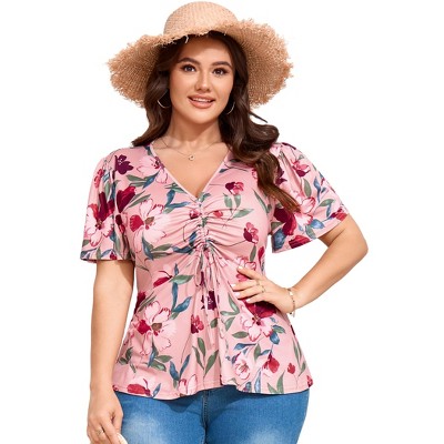 Women Plus Size Shirt V Neck Short Sleeve Blouse Peplum Floral Shirt Drawstring Tunic Top Ruffle Tops