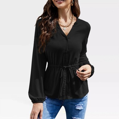 Women's Long Sleeve Shirts with Front Button Down V Neck - Casual Peplum Blouse with Waist Drawstring and Gathered Cuff Tops