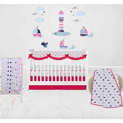 Bacati - Girls Nautical Muslin Whales Boat Pink Blue Navy 8 pc Crib Bedding Set with Long Rail Guard Cover
