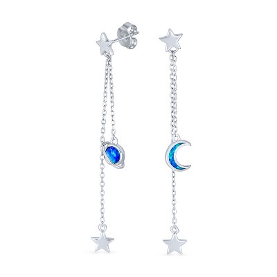 Bling Jewelry Elegant Celestial Crescent Moon Stars Long Chain Dangle Earrings Blue Synthetic Opal Inlay 925 Sterling Silver