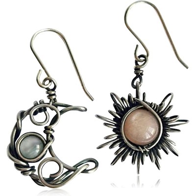 Abstract Hollow Asymmetry Drop Earrings - Black Silver Moon, Star & Sun with Moonstone, Hypoallergenic Statement Gift
