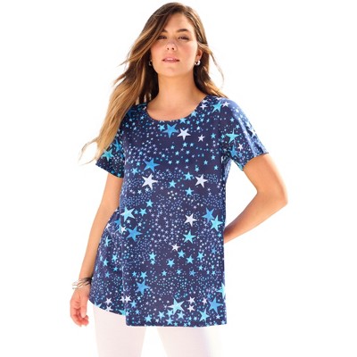 Roaman's Plus Size Ultimate Cotton Crewneck Short Sleeve Swing Tee - 4X, Navy Stars