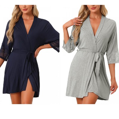 INSPIRE CHIC Women's 2 Pcs Zip Waffle Robes 3/4-Sleeve Bathrobe Knee-Length Housecoat Short Sleepwear with Pockets