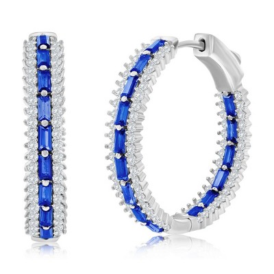 Bella Silver Sterling Silver, Center Baguette & Round CZ Hoop Earrings - Sapphire - Blue