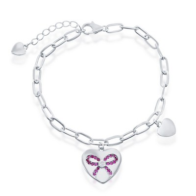 Bella Silver Sterling Silver Heart with CZ Ribbon Paperclip Bracelet - Silver - 6+1 Inch