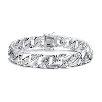 Guili Mens Rhodium Plated Sterling Silver Braided Cuban Chain Bracelet with Iced Out Cubic Zirconia Stones for a Bold and Dazzling Statement Piece