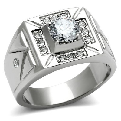 Slickblue Men's Silver Statement Ring, 9 mm CZ Center Stone with Channel Accent, Polished Stainless Steel, Sizes 8–13