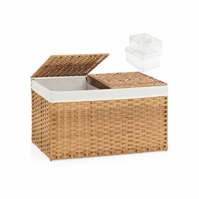 Aoibox Woven Rattan Storage Basket with 2 Separate Lids 17.2 Gallon Foldable Removable Liner Handles 22x13x13.8 Inches