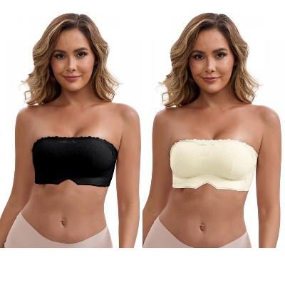 INSPIRE CHIC Women's Lace Anti-Slip Strapless Wireless Padded Tube Push-Up Lightweight Soft Full Cup Bandeau Bras 2 Packs