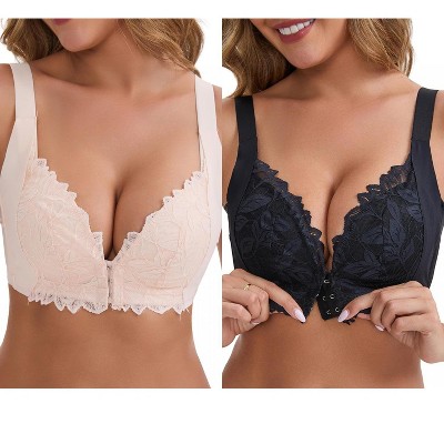 INSPIRE CHIC Women's Deep V Adjustable Straps Soft Underwire Support Minimizers Push-Up Front Closure Lace Bras 2 Packs