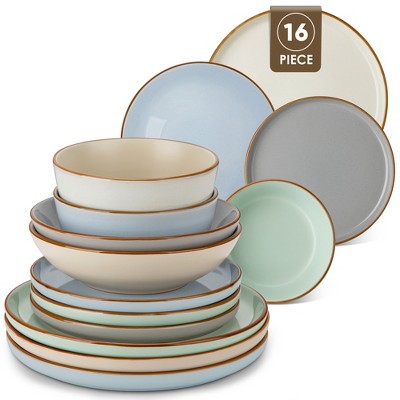 vancasso 16-Piece Mix Color Sesame Stoneware Dinnerware Set for 4 - Two-Tone Matte & Glossy Glaze with Curved Raised Rim, Includes Plates & Bowls