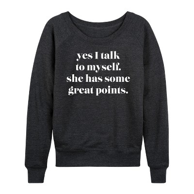 Women's - Instant Message - Yes I Talk To Myself; She Has Great Points Lightweight French Terry Wide Neck Long Sleeve Graphic Shirt