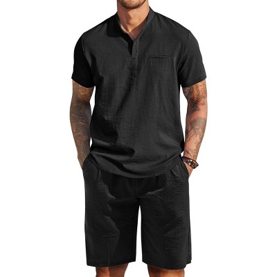 COOFANDY Men's 2 Piece Outfits Short Sleeve Henley Shirts and Shorts Summer Beach Yoga Pants Set