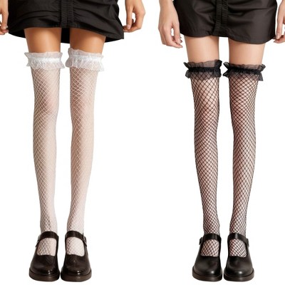 Anna-Kaci Women's Fishnet Thigh High Stockings with Ruffled Lace Top Detail and Soft Stretch Fit for Delicate Feminine Layered Styling