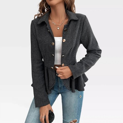 Womens Blazer Herringbone Collarless Notched Peplum Waist Suit Jakcets Tiny Stripes Faux Double Breasted Open Front Draped Blazer for Office