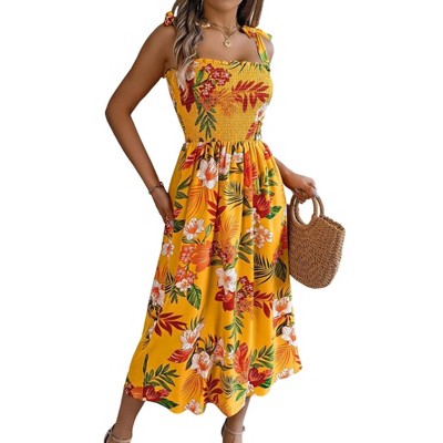 INSPIRE CHIC Women's Summer Flutter Short Sleeve Scoop Neck Tiered Flowy Tie Waist A-Line Midi Dress