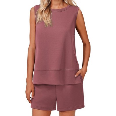 Pinspark Two Piece Sets for Women Summer Lounge Set Casual Sleeveless Crewneck Tops and Drawstring Short Outfits Tracksuit Side Slits