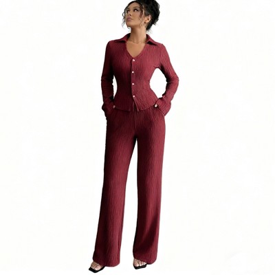 Women's Ribbed Knit Two Piece Set Buttoned Collared Shirt and Wide Leg Pants Outfit
