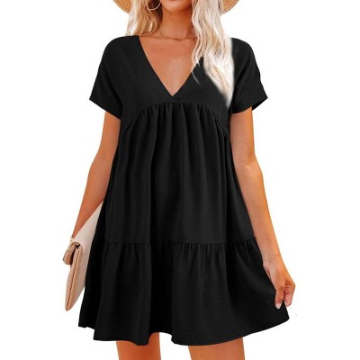 Imily Bela Summer Flowy Babydoll Dress V Neck Short Sleeve Swing Mini Tunic Casual