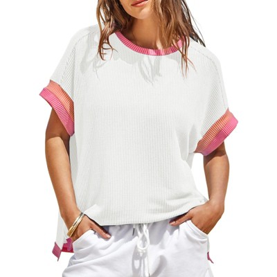 Imily Bela Womens Color Block Oversized Tops Trendy Casual Summer Textured Ribbed Knit T Shirts Loose Fit Short Sleeve Tshirts