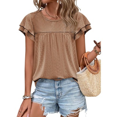 Clearlove Eyelet Tops for Women Summer Scoop Neck Cute Ruffled Short Sleeve T-Shirts Elegant Sweet Lady Tunic Blouses